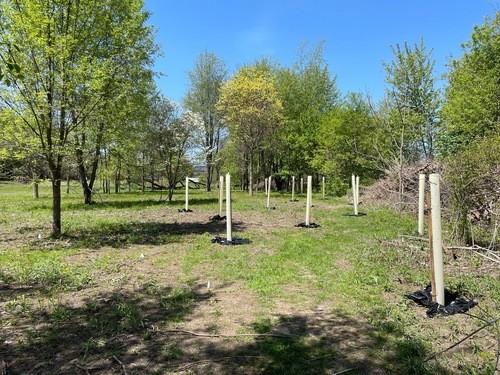 The new trees are about 12 inches tall, protected by tubing so the deer don’t eat them. Wherever you see a setup like this, you know a flowering tree has been planted. Shown below is the North section where many were planted together in a group. The white flowering dogwood in the background has some new buddies!