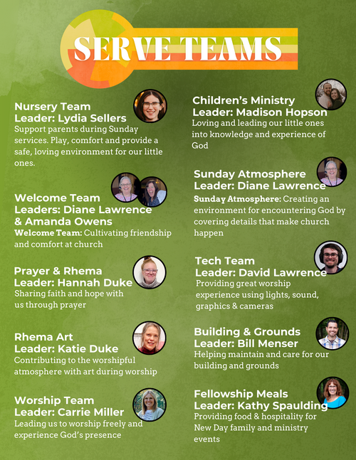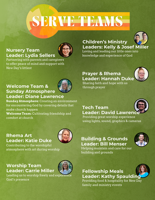 Believers worship God through song, prayer, Bible reading, generosity, and so many other ways too. Serving in a local family of believers provides a key way to show gratitude to our Lord. At New Day, the "serve year" runs from March to February, but you can always jump in during the serve year too! Check out the teams below and click the button below to express your interest in serving.